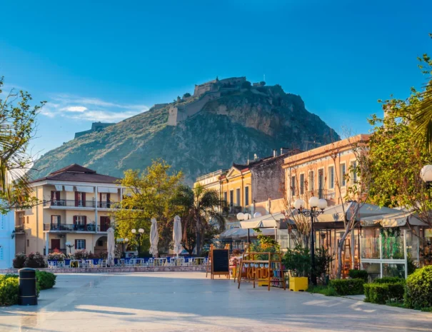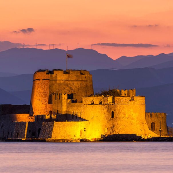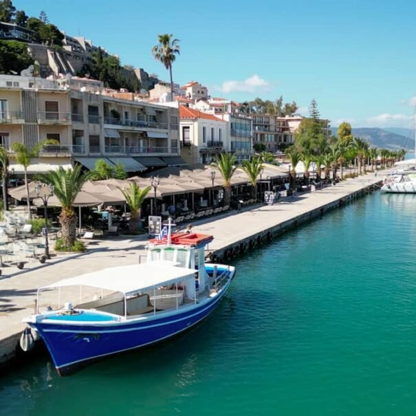 A scenic, well-protected harbour with views of Bourtzi Castle serves yachts, small cruise ships, and visitors to Nafplio’s Old Town, while the ancient fortress of Acronafplia rises above, offering panoramic views of the Argolic Gulf and layers of Greek, Venetian, and Ottoman history.
